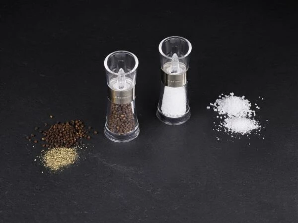 Das Set aus der Inverta Serie von Cole&Mason. Das Besondere bei den Inverta Mühlen ist, dass sich das Mahlwerk im Kopf der Mühle befindet. Zum Mahlen von Salz und Pfeffer muss die Mühle daher über Kopf gedreht werden, somit gibt es keine Reste auf Tisch und Arbeitsplatte mehr. Besonders schickes Acryl-Design mit hochwertigem Edelstahlband. Volle Geschmacksentfaltung durch die hochwertige Mahlwerke und ein sauberer Tisch machen diese Mühle zu einem Muss für jede Küche. Mit rostfreiem Karbonstahlmahlwerk für Pfeffer und Keramikmahlwerk für Salz.