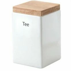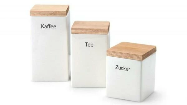 Vorratsdose quadratisch aus Keramik mit Holzdeckel. Deckel mit fest schließendem Silikonring. Perfekt für Kaffee, Tee oder Zucker.