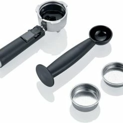 Hilfmittel für den perfekten Kaffeegenuss sind der doppelwandige Siebeinsätze für 1 und 2 Tassen, Kaffeelöffel mit integriertem Tamper und der Siebträger mit 2er Auslauf, alles im Lieferumfang enthalten.