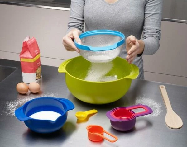 Die Nest-Kollektion von Joseph Joseph umfasst überaus praktisches, platzsparendes Küchenzubehör mit einer einzigartigen Reihe von Sets zur Speisenzubereitung. Dank ihres innovativen Designs können die einzelnen Elemente ordentlich ineinandergesteckt werden, wodurch sie nur sehr wenig Platz benötigen – ganz gleich, wo sie verstaut werden. Das Set umfasst 1 Tasse (5ml – 15ml), 1 Tasse (60 ml), 1 Tasse (85 ml), 1 Tasse (125 ml), 1 Tasse (250 ml), 1 kleine rutschfeste Rührschüssel mit Messskala (500 ml), 1 Sieb (1,65 l), 1 Durchschlag (3,0 l) sowie 1 große Rührschüssel (4,5 l). Die Rührschüsseln verfügen über eine rutschfeste Unterseite und breite Griffe. Die kleine Rührschüssel verfügt zusätzlich über eine Messskala an der Innenseite und einen handlichen Ausguss für ein einfaches Ausgießen. Das Sieb hat ein feines Gitter aus Edelstahl und der Durchschlag große Löcher.