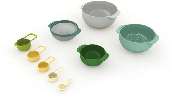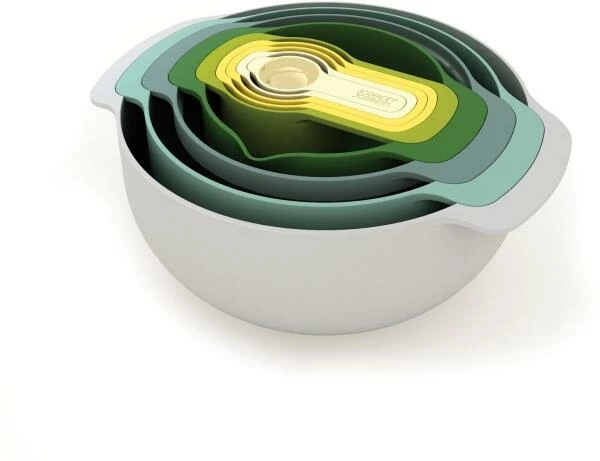 Die Nest-Kollektion von Joseph Joseph umfasst überaus praktisches, platzsparendes Küchenzubehör mit einer einzigartigen Reihe von Sets zur Essensvorbereitung. Dank ihres innovativen Designs können die einzelnen Elemente ordentlich ineinandergesteckt werden, wodurch sie nur sehr wenig Platz benötigen – ganz gleich, wo sie verstaut werden. Das Set umfasst 1 Tasse (5ml – 15ml), 1 Tasse (60 ml), 1 Tasse (85 ml), 1 Tasse (125 ml), 1 Tasse (250 ml), 1 kleine rutschfeste Rührschüssel mit Messskala (500 ml), 1 Sieb (1,65 l), 1 Durchschlag (3,0 l) sowie 1 große Rührschüssel (4,5 l). Die Rührschüsseln verfügen über eine rutschfeste Unterseite und breite Griffe. Die kleine Rührschüssel verfügt zusätzlich über eine Messskala an der Innenseite und einen handlichen Ausguss für ein einfaches Ausgießen.
