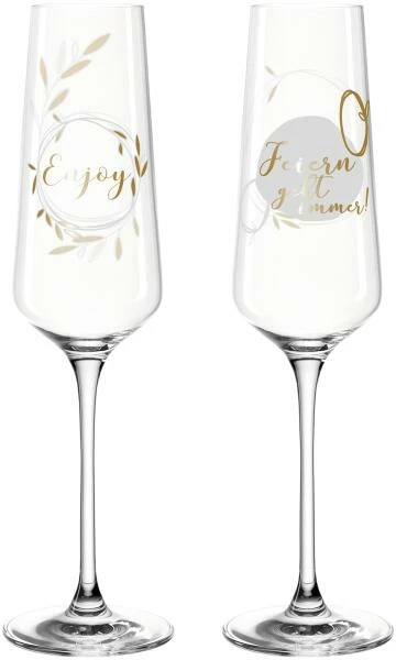 Die zwei Sektgläser mit den Sprüchen ’Enjoy’ und ’Feiern geht immer’ sind in der originellen Geschenkverpackung eine großartige Geschenkidee. Diese zwei Sektgläser sind optimal als Geburtstagsgeschenk für Ihre Freundin oder Freund. Geschenke, die ohne viele Worte Ihre Liebe zeigen. Der breite Boden des Kelches sorgt für eine optimale Entfaltung des Sektbouquets: Für den idealen Genuss von Sekt und Aperitifs. Das Teqton-Glas garantiert dauerhafte Brillanz und Transparenz und ist somit langanhaltend kristallklar. Sie sind spülmaschinengeeignet und somit besonders praktisch im Alltag. Sie erhalten hier ein Set bestehend aus 2 Sektgläsern. Für alle, die Wert auf Qualität legen – bestellen Sie am besten jetzt und verschönern Sie sich Ihr Zuhause mit diesen ansprechenden Sektgläsern. Besonders überzeugend als Geschenk.