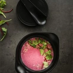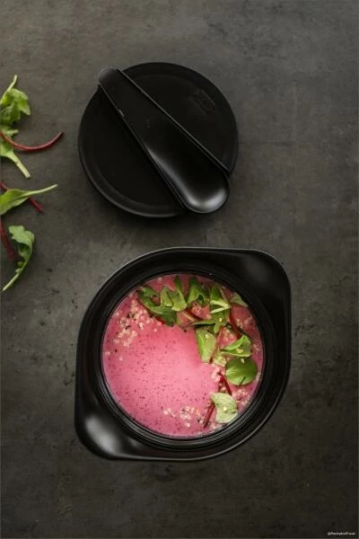 Dank des hermetisch schließenden Deckels können Sie diese doppelwandige Schale unbesorgt für Mahlzeiten unterwegs mitnehmen. Die Schale mit ihren Rundungen wurde so konzipiert, dass man sie mit nur einer oder mit beiden Händen fassen kann.