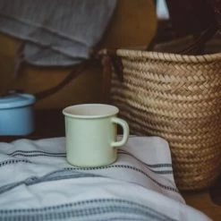 Riess Becher aus Emaille in nilgrün. Trinkbecher mit Griff und Bördelrand aus Emaille, ideal für Tee, Kaffee und andere Heiß- oder Kaltgetränke. Warme Getränke können direkt in der Tasse auf dem Herd erwärmt werden.