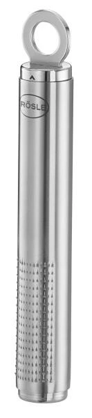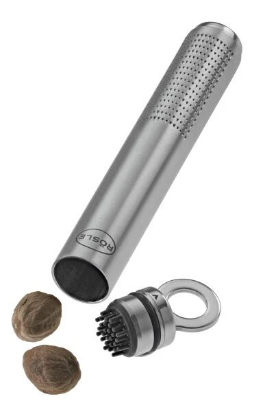 Rösle findet in jeder Gewürzschublade oder Hakenleiste Platz. Die Reibefläche verfügt über scharfe Zähne und sorgt damit für äußerst effektive Reibeergebnisse. Die Muskatnüsse können im Inneren aufbewahrt werden. Am Deckel ist eine robuste Silikonbürste intergiert. Spülmaschinengeeignet.