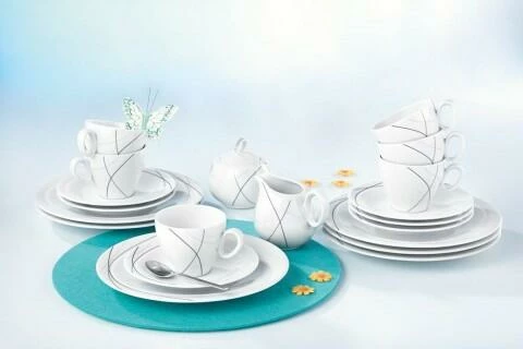 - Zusammensetzung: 6x Frühstücksteller 23 cm, 6x Kaffeetasse 0,23 l, 6x Kaffeeuntertasse 16 cm, 1x Milchkännchen 6 Personen, 1x Zuckerdose 6 Personen
