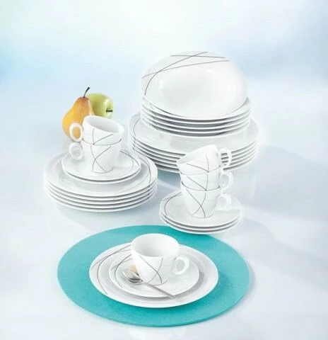 - Zusammensetzung: 6x Frühstücksteller 23 cm, 6x Kaffeetasse 0,23 l, 6x Kaffeeuntertasse 16 cm, 6x Speiseteller 28 cm, 6x Suppenteller 23 cm