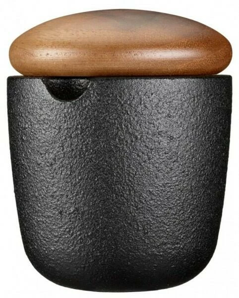 Skeppshult Salzbehälter Kleiner Swing in walnuss. Die gusseiserne Kräuter- und Salzschale mit einem Deckel aus edlem Walnussholz.